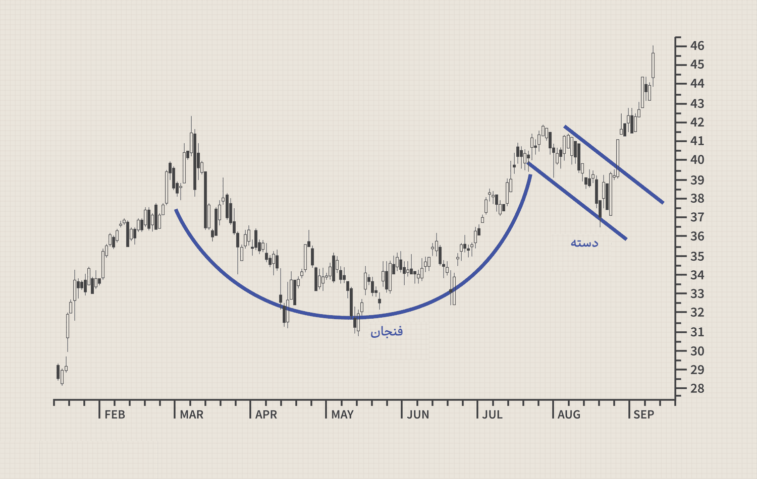 توضیح الگو الگوی فنجان و دسته یک الگوی ادامه‌دهنده صعودی است که به دلیل شکل ظاهری شبیه به یک فنجان با دسته کوچک شناخته می‌شود. این الگو معمولاً در تایم فریم‌های بلندمدت شکل می‌گیرد و نشان‌دهنده یک روند صعودی قوی پس از یک دوره اصلاح است.  مراحل تشکیل