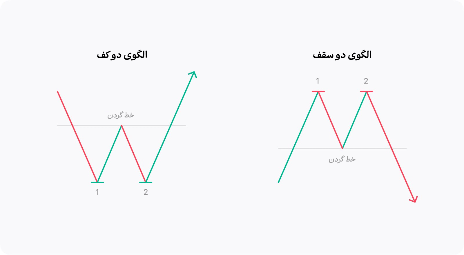 توضیح الگو الگوی سقف دوقلو (Double Top) یا کف دوقلو (Double Bottom) و نسخه پیشرفته‌تر آن، سقف سه‌قلو (Triple Top) و کف سه‌قلو (Triple Bottom)، از دیگر الگوهای برگشتی پرکاربرد هستند. این الگوها نشان‌دهنده ناتوانی قیمت در عبور از یک سطح مقاومت (در سقف) یا حمایت (در کف) هستند.  سقف دوقلو این الگو در پایان یک روند صعودی شکل می‌گیرد. قیمت دو بار به یک سطح مقاومت برخورد می‌کند و نمی‌تواند آن را بشکند، سپس به سمت پایین بازمی‌گردد. شکست سطح حمایت (خط گردن) تأییدیه شروع روند نزولی است.  کف دوقلو این الگو در پایان یک روند نزولی شکل می‌گیرد. قیمت دو بار به یک سطح حمایت برخورد می‌کند و نمی‌تواند آن را بشکند، سپس به سمت بالا بازمی‌گردد. شکست سطح مقاومت (خط گردن) تأییدیه شروع روند صعودی است.  سقف و کف سه‌قلو این الگوها مشابه دوقلو هستند، اما به‌جای دو برخورد، سه برخورد با سطح مقاومت یا حمایت رخ می‌دهد. این الگوها معمولاً نشان‌دهنده قدرت بیشتر سطح مقاومت یا حمایت هستند.  نحوه شناسایی