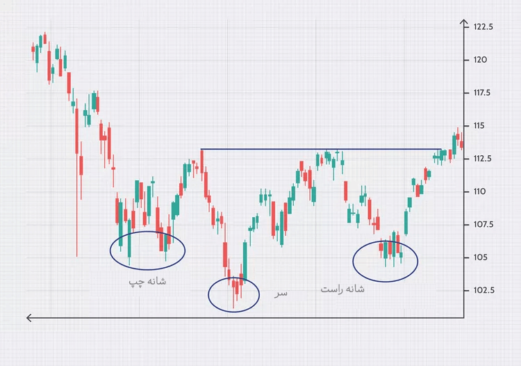 •  سر: قله دوم که بالاتر از شانه چپ است و اوج اصلی روند صعودی را نشان می‌دهد.