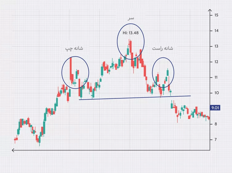 •  شانه راست: قله سوم که معمولاً در سطحی نزدیک به شانه چپ قرار دارد و نشان‌دهنده ضعف در روند صعودی است.