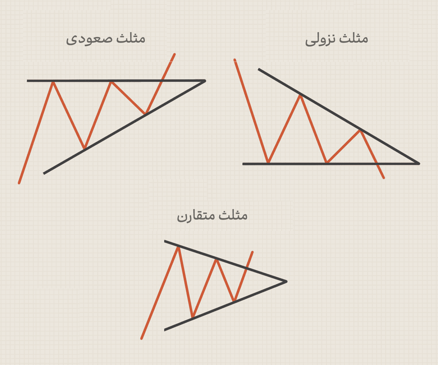 •  مثلث متقارن (Symmetrical Triangle): دارای دو خط همگرا که به یک رأس می‌رسند.
